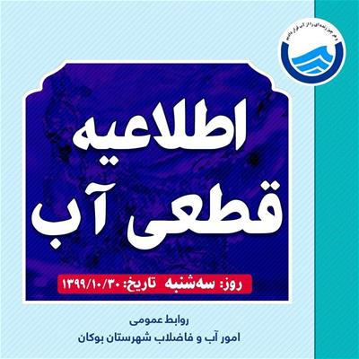 به گزارش روابط عمومی فرمانداری شهرستان بوکان؛ روز سهشنبه (۹۹/۱۰/۳۰) روابط عمومی امور آب و فاضلاب شهرستان بوکان اطلاعیهای در خصوص قطعی آب در منطقه امیرآباد منتشر کرد.