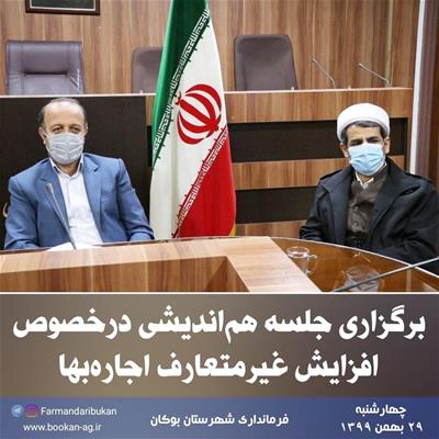 برگزاری جلسه هماندیشی درخصوص افزایش غیرمتعارف اجارهبها با حضور امام جمعه، «امینزاده» فرماندار بوکان، جمعی از مسئولین شهرستان، اعضای اتحادیه مشاورین املاک و تعدادی از معتمدین شهرستان در محل سالن جلسات فرمانداری
