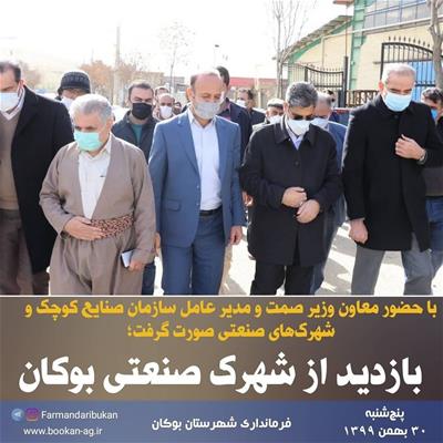 به گزارش روابط عمومی فرمانداری شهرستان بوکان، روز پنجشنبه (۹۹/۱۱/۳۰) معاون وزیر صمت و مدیر عامل سازمان صنایع کوچک و شهرکهای صنعتی و معاون هماهنگی امور اقتصادی استاندار آذربایجانغربی به همراه امام جمعه، فرماندار بوکان و نماینده مردم بوکان در مجلس شورای اسلامی، مدیرکل صنعت، معدن و تجارت آذربایجانغربی و مدیرعامل شرکت شهرکهای صنعتی استان آذربایجان غربی از شهرک صنعتی بوکان بازدید بعمل آوردند.