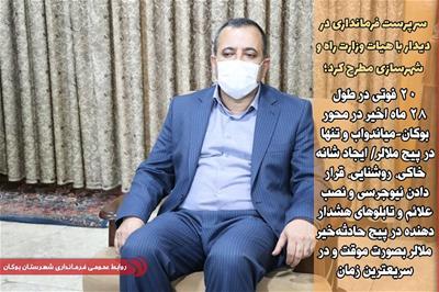 ✍به گزارش روابط عمومی فرمانداری شهرستان بوکان، سرپرست فرمانداری در دیدار با هیاتی از وزارت راه و شهرسازی گفت با وضعیت فعلی اگه پیمانکار بخواهد نسبت به حذف پیچ ملالر و ایجاد واریانت اقدام کند، با توجه به برآورد حجم ۸۰۰هزار مترمکعب خاکبرداری، حداقل ۲ سال زمانبر خواهد بود و این امر نه مورد قبول ما و نه مردم بوکان است و با توجه به وضعیت فعلی ماشین آلات و انجام کار توسط پیمانکار، بایستی وزارت راه و شهرسازی راهحلهای دیگری همچون انفجار و یا افزایش دو سه برابری ماشین آلات در نظر داشته باشد.