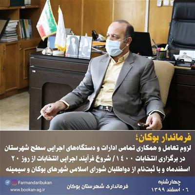 به گزارش روابط عمومی فرمانداری شهرستان بوکان، روز چهارشنبه (۹۹/۱۲/۰۶) جلسه هماهنگی برگزاری انتخابات ۱۴۰۰ با ریاست «امینزاده» فرماندار بوکان و حضور بخشداران مرکزی و سیمینه و کارشناسان فرمانداری برگزار شد.