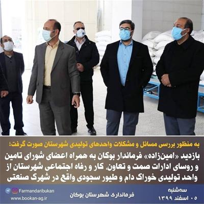 بازدید «امینزاده» فرماندار بوکان به همراه اعضای شورای تامین و روسای ادارات صمت و تعاون، کار و رفاه اجتماعی شهرستان از واحد تولیدی خوراک دام و طیور سجودی واقع در شهرک صنعتی