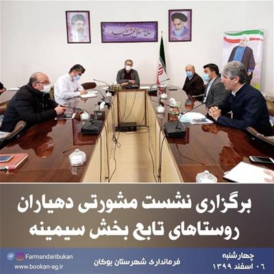 برگزاری نشست مشورتی دهیاران روستاهای تابع بخش سیمینه با ریاست «محمدی» بخشدار سیمینه و حضور سرپرست بنیاد مسکن شهرستان بوکان، رئیس شورای اسلامی بخش سیمینه، رئیس شورای اسلامی شهرستان، کارشناسان بخشداری سیمینه، کارشناسان کمیته امداد امام خمینی (ره) شهرستان بوکان و دهیاران روستاهای تابع بخش سیمینه