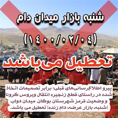 پیرو اطلاعرسانیهای قبلی؛ برابر تصمیمات اتخاذ شده در راستای قطع زنجیره انتقال ویروس کرونا و وضعیت قرمز شهرستان بوکان، میدان دواب (شنبه بازار عرضه دام زنده) تعطیل می باشد.