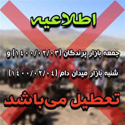 جمعه بازار پرندگان (۱۴۰۰/۰۲/۰۳) و شنبه بازار میدان دام (۱۴۰۰/۰۲/۰۴) بوکان تعطیل میباشد.
