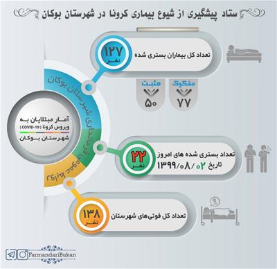 اینفوگرافیک آخرین آمار مبتلایان به بیماری کرونا در شهرستان بوکان (۹۹/۰۸/۰۲)
