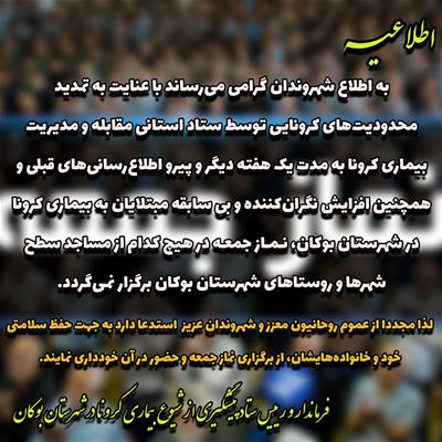 به اطلاع شهروندان گرامی میرساند با عنایت به تمدید محدودیتهای کرونایی توسط ستاد استانی مقابله و مدیریت بیماری کرونا به مدت یک هفته دیگر و پیرو اطلاعرسانیهای قبلی و همچنین افزایش نگرانکننده و بی سابقه مبتلایان به بیماری کرونا در شهرستان بوکان، نـمـاز جمعـه در هیچ کدام از مساجد سطح شهرها و روستاهای شهرستان بوکان برگزار نمیگردد.