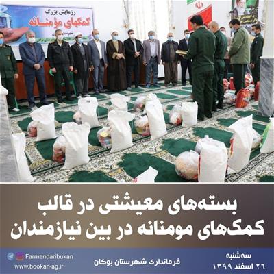 با حضور امام جمعه، فرماندار شهرستان بوکان و جمعی از مسئولین شهرستان و به مناسبت اعیاد شعبان و فرا رسیدن سال نو بسته.های معیشتی در قالب کمک های مومنانه در بین نیازمندان شهرستان بوکان توزیع شد.