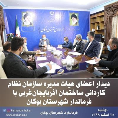 دیدار اعضای هیات مدیره سازمان نظام کاردانی ساختمان آذربایجانغربی و مسئول دفتر نمایندگی شهرستان به همراه رییس بنیاد مسکن انقلاب اسلامی و کارشناس اداره راه و شهرسازی شهرستان بوکان با «امینزاده» فرماندار شهرستان بوکان