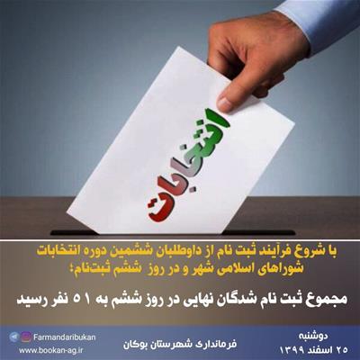 به گزارش روابط عمومی فرمانداری شهرستان بوکان، روز دوشنبه (۹۹/۱۲/۲۵) تعداد ۵۱ نفر برای حضور در انتخابات شوراهای اسلامی شهرهای بوکان و سیمینه با استفاده از روشهای غیرحضوری و حضوری نسبت به ثبتنام اقدام کردند و ثبتنامشان نهایی و تایید شده است.