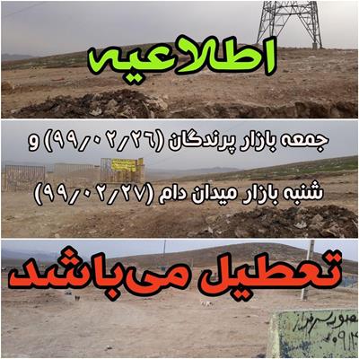 جمعه بازار پرندگان (۹۹/۰۲/۲۶) و شنبه بازار میدان دام (۹۹/۰۲/۲۷) تعطیل می باشد.