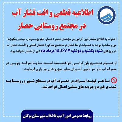 🔹احتراما به اطلاع مشترکین گرامی در مجتمع حصار (حصار، کهریزه سردار، تبت و ینگیجه) می رساند با توجه به عملیات ارتقا فشار در مجتمع مذکور احتمال قطعی و افشت فشار آب در روزهای شنبه، یکشنبه و دوشنبه 15،16،17 مرداد ماه دور از انتظار نخواهد بود.