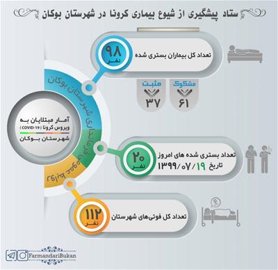بدینوسیله به اطلاع همشهریان عزیز میرساند تنها در مدت دو روز گذشته تعداد ۳۸ نفر در بیمارستان بستری شدهاند و مجموع بستری شدگان به تعداد ۹۸ نفر رسیده است که از این تعداد ۱۸ نفر متاسفانه در آی سی یو بستری هستند.