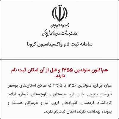 وزارت بهداشت: سامانه ثبتنام تزریق واکسن کرونا salamat.gov.ir برای متولدین ۱۳۵۵ و قبل باز شد.