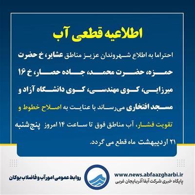 احتراما به اطلاع شهروندان عزیز مناطق عشایر، خ حضرت حمزه، حضرت محمد، جاده حصار، خ 16 میرزایی، کوی مهندسی، کوی دانشگاه آزاد و مسجد افتخاری میرساند با عنایت به اصلاح خطوط و تقویت فشار شبکه، آب مناطق فوق تا ساعت 14 امروز پنجشنبه 21 اردیبهشت ماه قطع می گردد.