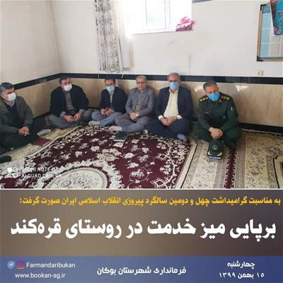 برپایی میز خدمت همزمان با چهارمین روز از ایام الله دهه فجر در محل مسجد روستای قرهکند با حضور «خضری» بخشدار مرکزی، جمعی از مسئولین شهرستان و مردم روستاهای قرهکند، سیفالدین سفلی و علیا، چاورچین، شیخلر، کهریزه علیآقا، کانیطومار، دنگز، آختطار، سردرآباد