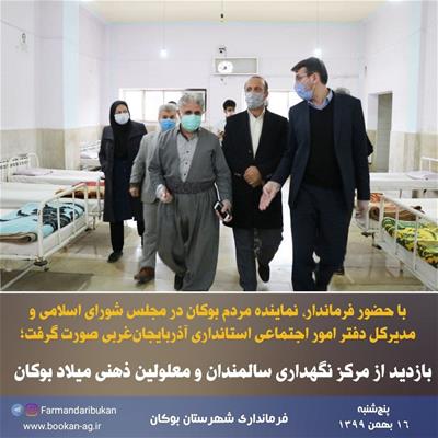 به گزارش روابط عمومی فرمانداری شهرستان بوکان، روز پنجشنبه (۹۹/۱۱/۱۶) «امینزاده» فرماندار بوکان به همراه «حبیبزاده» نماینده مردم بوکان در مجلس شورای اسلامی، «طباطبایی» مدیرکل دفتر امور اجتماعی استانداری آذربایجانغربی و «احمدنژاد» رییس اداره بهزیستی شهرستان از مرکز نگهداری سالمندان و معلولین ذهنی میلاد بوکان بازدید بعمل آوردند.