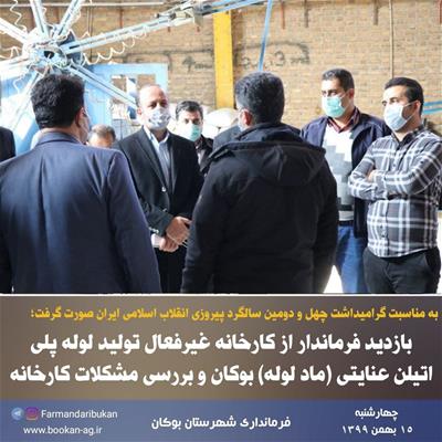 بازدید «امینزاده» فرماندار بوکان به همراه فرمانده سپاه پاسداران و جمعی از مسئولین شهرستان از کارخانه غیرفعال تولید لوله پلی اتیلن عنایتی (ماد لوله) بوکان واقع در شهرک صنعتی و بررسی مشکلات کارخانه همزمان با چهارمین روز از ایام الله دهه فجر