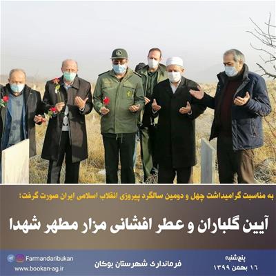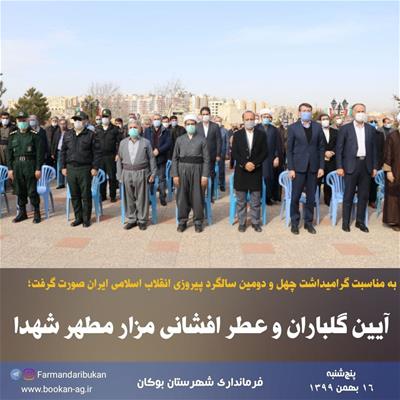 به گزارش روابط عمومی فرمانداری شهرستان بوکان، روز پنجشنبه (۹۹/۱۱/۱۶) آیین گلباران و عطر افشانی مزار مطهر شهدا با حضور امام جمعه، فرماندار بوکان، نماینده مردم بوکان در مجلس شورای اسلامی، مدیرکل بنیاد شهید و امور ایثارگران آذربایجانغربی، مدیرکل دفتر امور اجتماعی استانداری آذربایجانغربی، اعضای شورای تامین و جمعی از مسئولین استانی و شهرستانی همزمان با پنجمین روز از ایام الله دهه فجر برگزار شد.