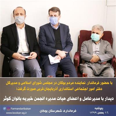 به گزارش روابط عمومی فرمانداری شهرستان بوکان، روز پنجشنبه (۹۹/۱۱/۱۶) «امینزاده» فرماندار بوکان به همراه «حبیبزاده» نماینده مردم بوکان در مجلس شورای اسلامی و «طباطبایی» مدیرکل دفتر امور اجتماعی استانداری آذربایجانغربی از دفتر انجمن خیریه بانوان کوثر بازدید و با مدیرعامل و اعضای هیات مدیره انجمن دیدار بعمل آوردند.