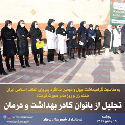 تجلیل از بانوان کادر بهداشت و درمان همزمان با پنجمین روز از ایام الله دهه فجر با حضور «امینزاده» فرماندار بوکان ، «حبیبزاده» نماینده مردم بوکان در مجلس شورای اسلامی، اعضای شورای تامین و جمعی از مسئولین شهرستان