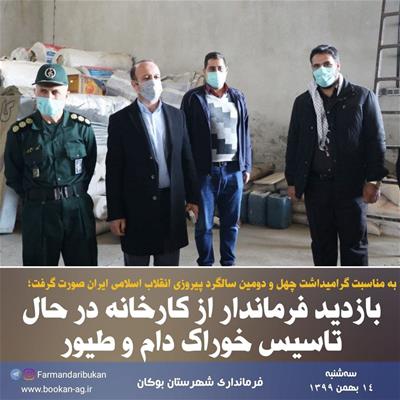 بازدید «امینزاده» فرماندار بوکان به همراه فرمانده سپاه پاسداران و جمعی از مسئولین شهرستان از کارخانه درحال تاسیس خوراک دام و طیور با سرمایهگذاری بیش از ۲۰۰ میلیارد ریال و با پیشرفت فیزیکی ۷۰ درصد واقع در شهرک صنعتی همزمان با چهارمین روز از ایام الله دهه فجر