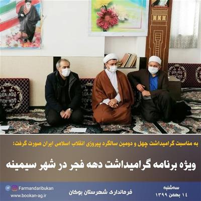 برگزاری ویژه برنامه گرامیداشت دهه فجر و سالگرد پیروزی انقلاب اسلامی و گرامیداشت میلاد با سعادت حضرت فاطمه زهرا (س)، هفته زن و روز مادر با حضور امام جمعه شهر سیمینه، بخشدار سیمینه، مسئول دفتر نمایندگی ولی فقیه در سپاه بوکان و مسئولین ادارات، کارکنان و دیگر اقشار مردم با رعایت پروتکلهای بهداشتی در محل مسجد جامع شهر سیمینه