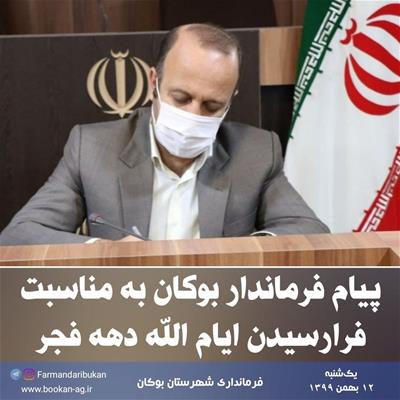 به گزارش روابط عمومی فرمانداری شهرستان بوکان، «محمد امینزاده» فرماندار بوکان به مناسبت فرا رسیدن ایام الله دهه مبارک فجر و چهل و دومین سالگرد پیروزی انقلاب شکوهمند اسلامی پیام تبریکی صادر کرد.