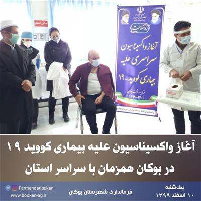 آغاز واکسیناسیون علیه بیماری کووید ۱۹ در بوکان همزمان با سراسر استان با حضور امام جمعه، فرماندار بوکان، اعضای شورای تامین و جمعی از مسئولین شهرستان با تزریق واکسن اسپوتنیک V، در بیمارستان شهید دکتر قلی پور بوکان