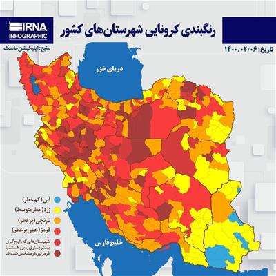 به گزارش وزارت بهداشت، ۱۱۰ شهرستان از وضعیت قرمز خارج شدهاند و اکنون ۱۹۸ شهرستان در وضعیت قرمز، ۱۵۷ شهرستان نارنجی، ۸۴ شهرستان زرد و ۹شهرستان آبی هستند.